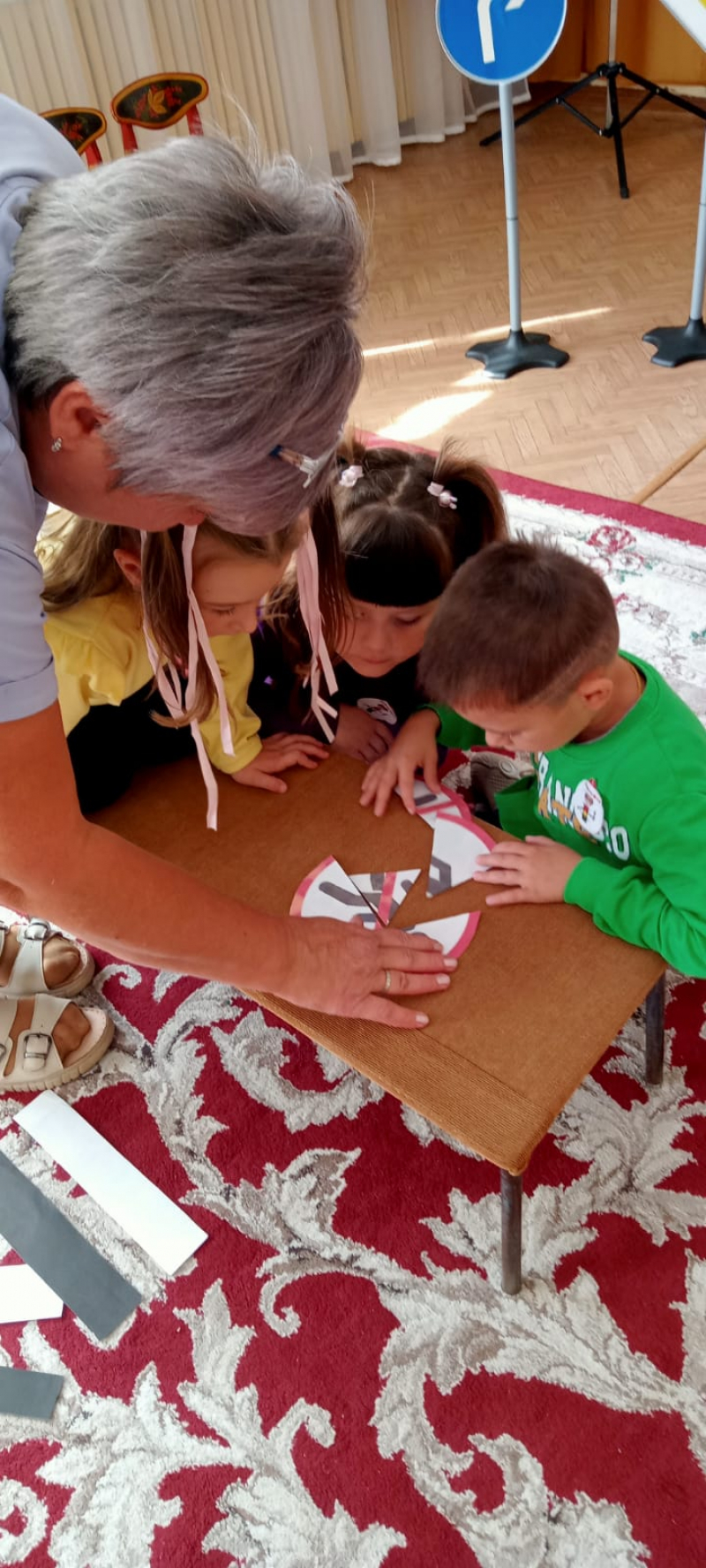 Дети собирают в командах разрезные дорожные знаки. Собрав, называют знак и объясняют, что этот знак обозначает. («Пешеходный переход», «Осторожно, дети»)